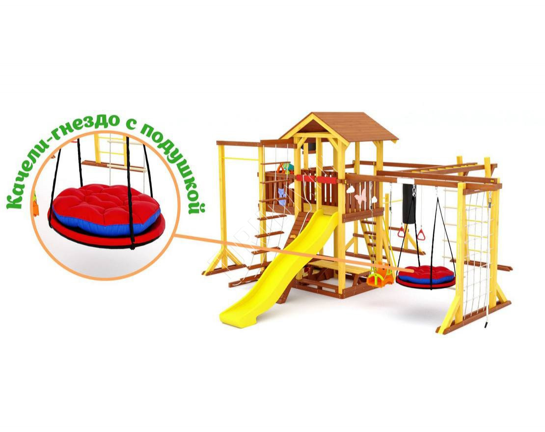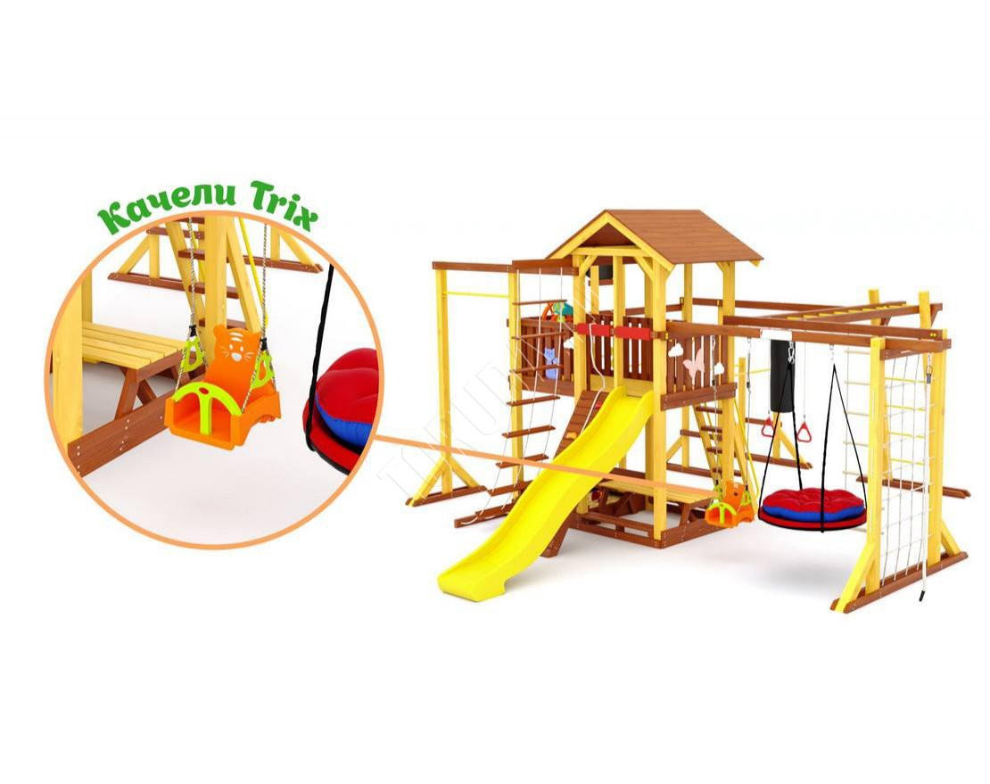 - Многообразие игровых элементов: в комплектацию входят скалодром, сетка-лазалка, турники, гимнастические кольца, песочница с крышкой, которая трансформируется в две лавочки, и многое другое.