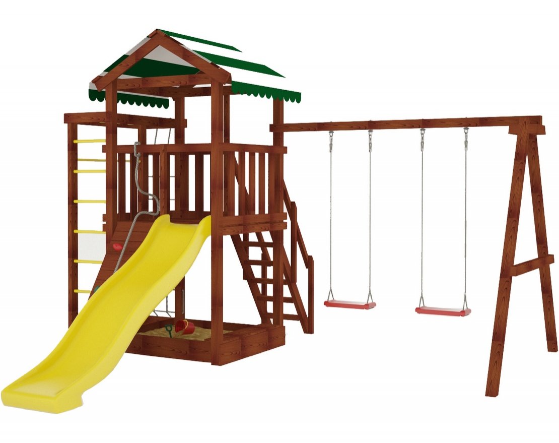 Конструкция, качество дерева и качельные подвесы соответствуют ГОСТ. Основной материал натуральный – это экологичный клееный брус, он гладкий на ощупь, его углы скруглены во избежание получения ссадин. Дерево обработано пропиткой. Площадка полностью безопасна: все крепежи и болты плотно закрыты заглушками, а спортивное оборудование используется от проверенного сертифицированного бельгийского производителя.