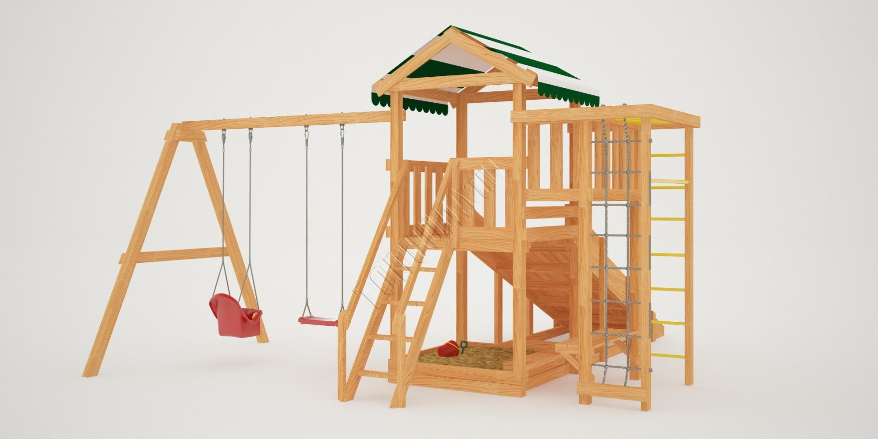 Конструкция сертифицирована и безопасна. Крепежи скрыты под хорошо закрепленными заглушками – поэтому даже малыши не поранятся. Каркас состоит из натуральных деталей – клееного бруса квадратного сечения со стороной 75 мм. Во избежание получения заноз и ссадин дерево отшлифовано, а края скруглены. Материал экологичен и не имеет лакокрасочного покрытия.