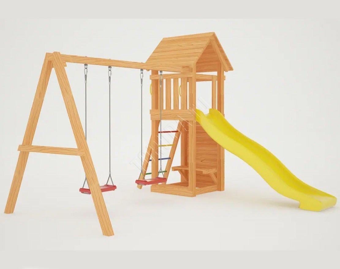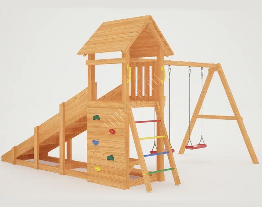 Основной материал натуральный и экологичный – это шлифованный клееный брус, края которого скруглены. Занозы и ссадины исключены. Детская площадка безопасна: конструкция рамы произведена согласно ГОСТ, все крепежи закрыты заглушками, а подвесное снаряжение сертифицировано и создано специально для детей в Бельгии.