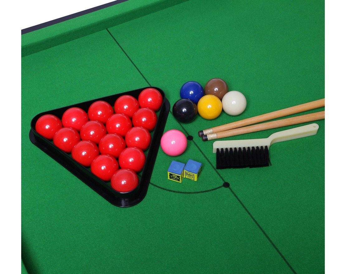 Модель поставляется с комплектом всех необходимых для игры аксессуаров: односоставные кии (2 шт.), набор из 22-х шаров, два мела, треугольник и щетка для ухода за поверхностью сукна.